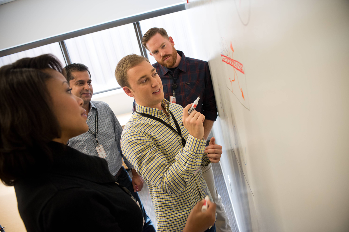 Associates collaborating at a whiteboard